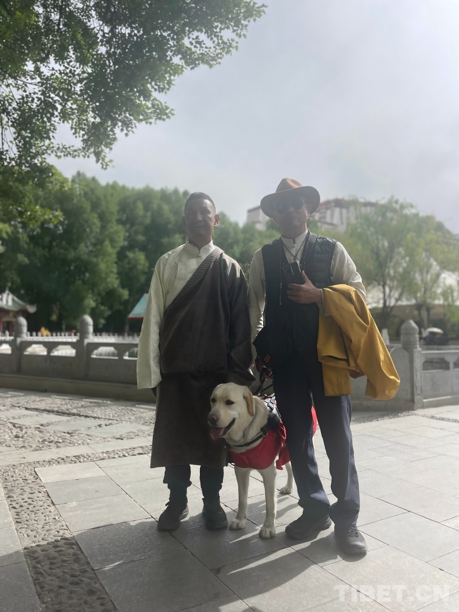 2024年5月,达琼(左)和王永东,与导盲犬福桔在拉萨合影