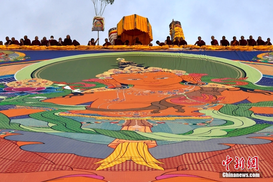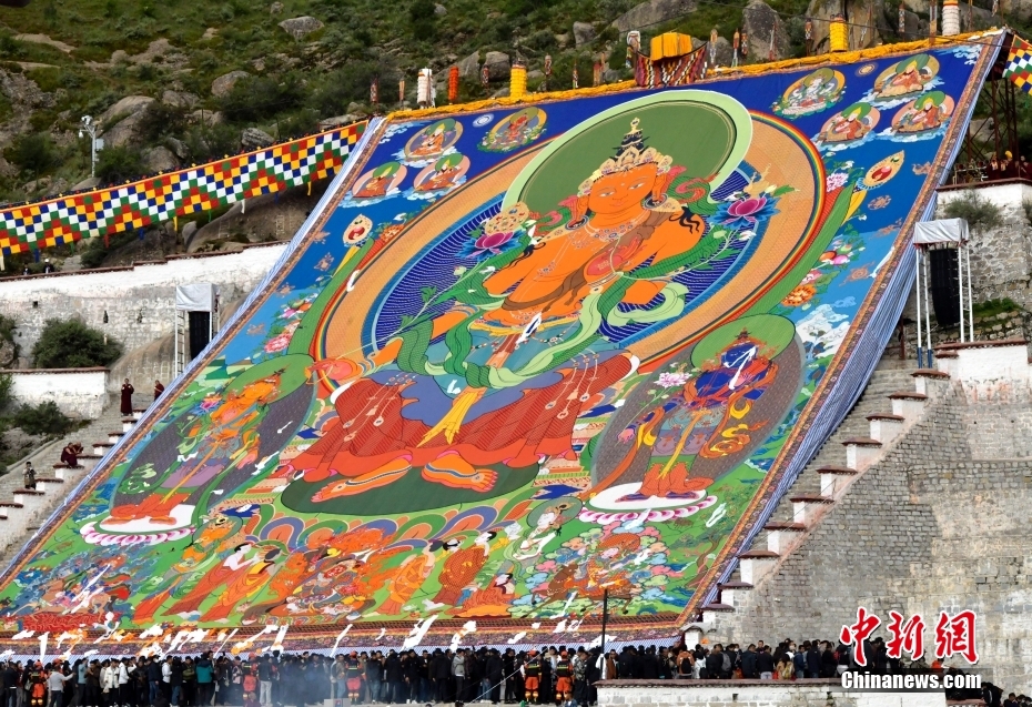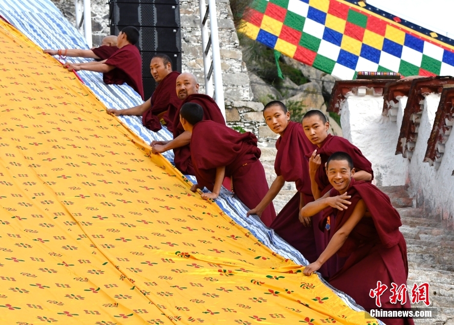 8月16日,巨幅强巴佛唐卡徐徐展开。