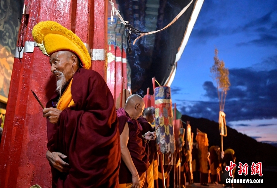 8月16日,拉萨哲蚌寺僧众燃香为迎请唐卡的队伍开道。