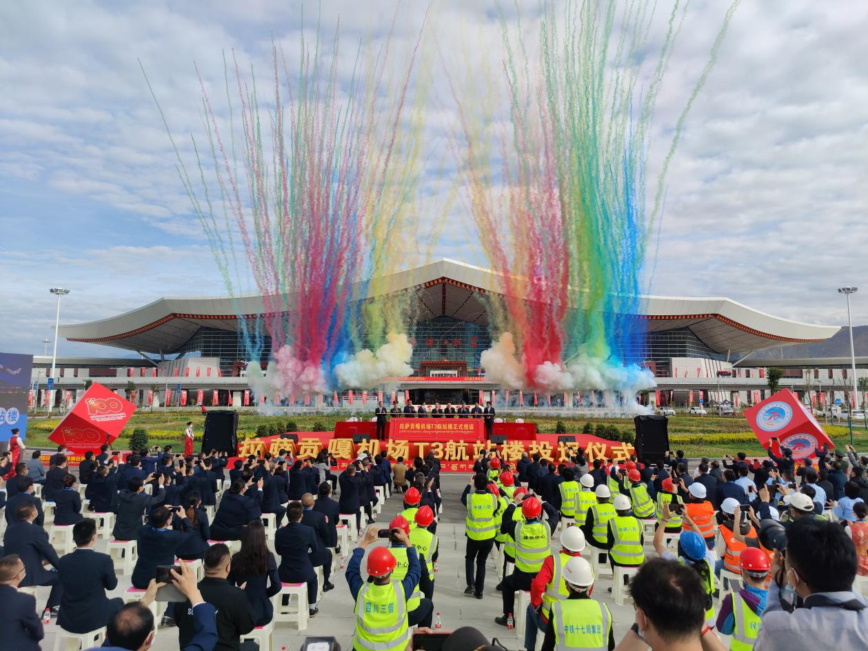 党的十八大以来,随着西藏旅游业的持续繁荣和航空运输需求的快速增长,拉萨贡嘎机场再次迎来了发展的春天。跑道延长至4000米,可起降波音747等大型客机。拉萨贡嘎机场T3航站楼于2021年8月6日投用,面积达8.8万平方米,设计容量为年旅客吞吐量900万人次、年货邮吞吐量8万吨;T3航站楼采用了智能照明控制和能耗监控系统,设置了自助值机和自动行李分拣系统,设计上融合了现代设计与民族地域元素。