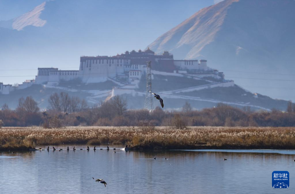 12月20日,斑头雁飞翔在拉鲁湿地上空。新华社记者 晋美多吉 摄