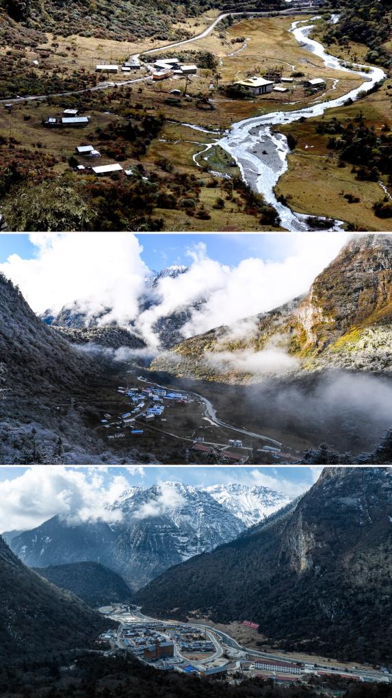 拼版照片:上图是2003年10月26日拍摄的玉麦乡(新华社记者索朗罗布摄);中图是2017年10月31日拍摄的玉麦乡(新华社记者普布扎西摄);下图是2026年2月5日拍摄的玉麦乡(无人机照片,新华社记者丁增尼达摄)。