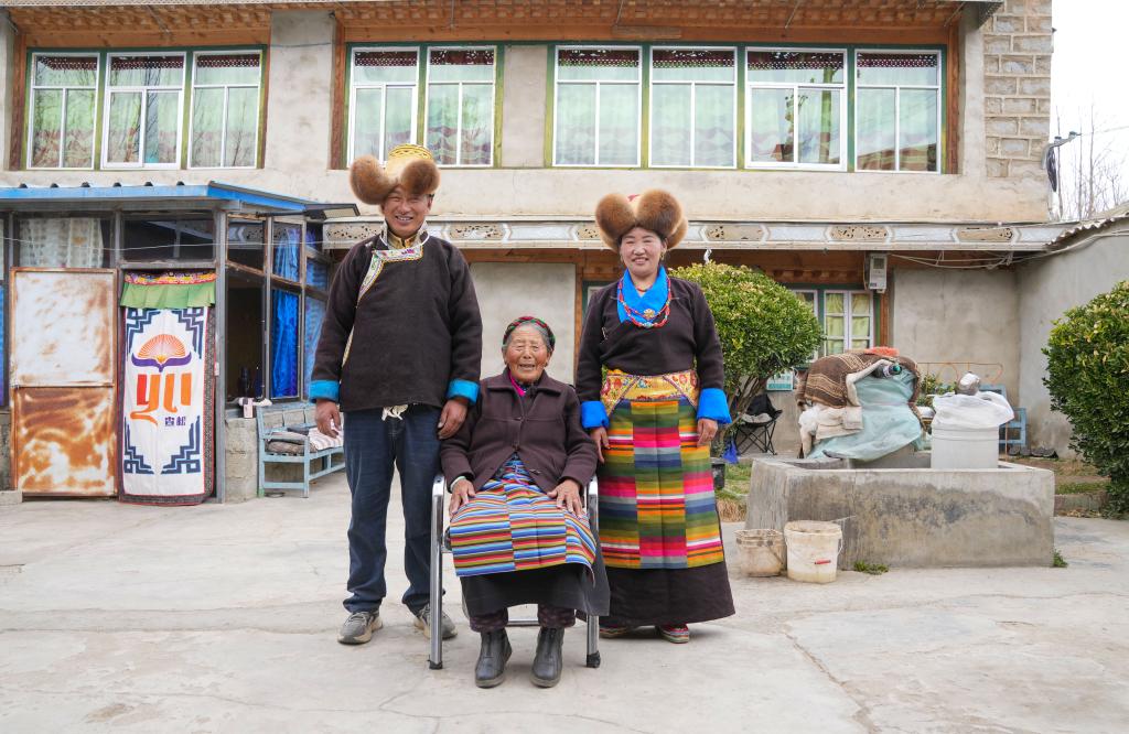 阿旺卓玛(中)和家人合影(3月16日摄)。