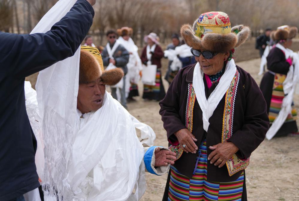 阿旺卓玛(左)在春耕仪式上和乡亲们攀谈(3月16日摄)。